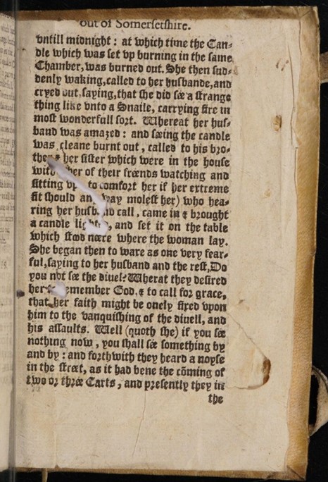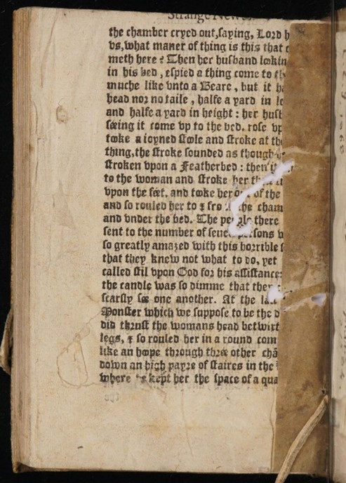 These examples show how waste material can preserve items that generally have low survival rates. Strangely, being used as waste material is sometimes the main reason a text survives. One such example has been identified and catalogued at Wellcome. Fragments of A true and most dreadfull discourse of a woman [Margaret Cooper] possessed with deuill; who in the likenesse of a headlesse beare fetcher her out of her bedd … on the fower and twentie of May last. 1584, at Dichet in Sommersetshire, a pamphlet published in 1584, were discovered as waste material in an edition of The treasury of Health from 1585 and catalogued as a separate item bound in the same volume. This shows how transient such a pamphlet was – within a year of publication, it was already used to bind new books in a different printer’s workshop. This was not unusual. In my analysis of lost books – ones that cannot be traced to an existing copy – printed in early modern England, I found that newsprint on events in Britain had a lower survival rate than news on events on the continent and further afield. According to the English Short Title Catalogue, an international online union catalogue of books printed in British languages, there is only one other recorded copy of the pamphlet in the world, stored at the British Library [C.27.a.6.].