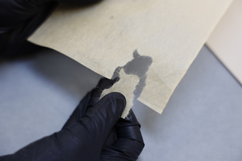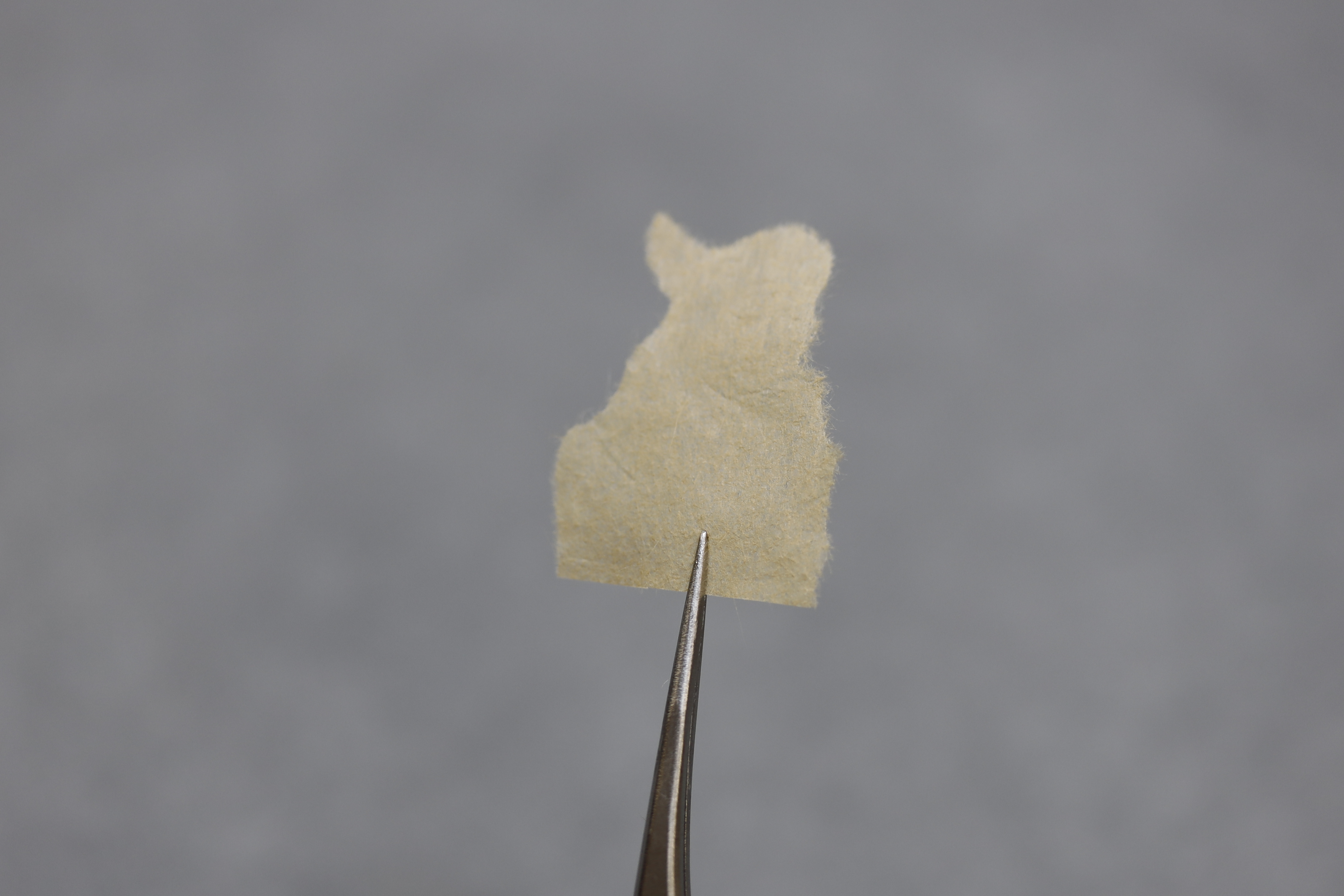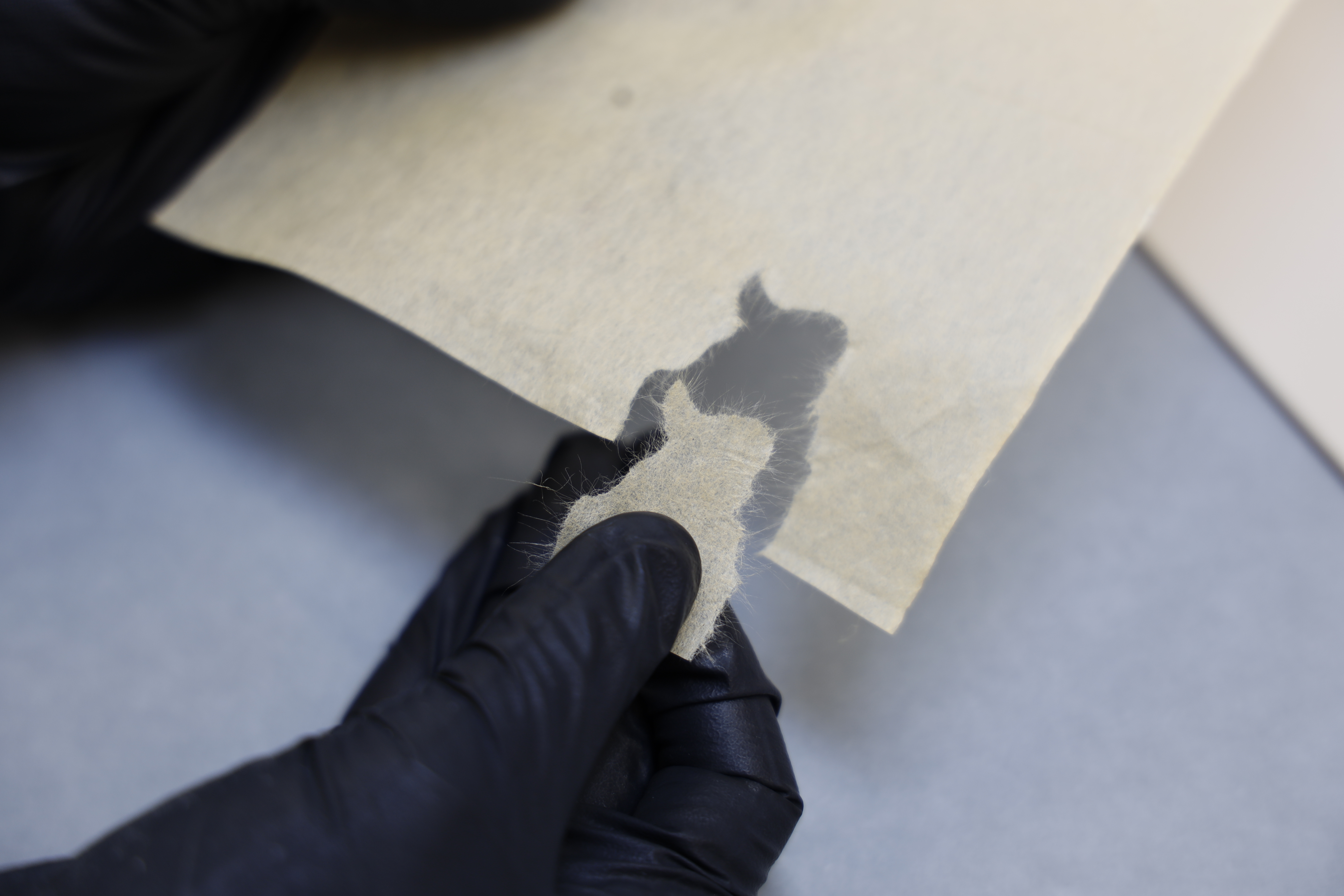 Traditionally, infill shapes are cut using manual tools such as a scalpel or punch, depending on the desired outcome. Perforation involves mechanically puncturing the paper at regular intervals along a predefined contour. This trail of perforations weakens the fibres locally, enabling them to be gently torn apart using a damp brush, producing soft, irregular edges. This technique has long been used by paper conservators to avoid sharp, mechanical cuts. The feathered edges help with adhesion and create a visually discreet transition between the fill and the original support. They also improve bonding stability and mechanical continuity of the support. However, each hole must be made individually, which becomes tedious and time-consuming in large-scale treatments or when working with oversize formats.