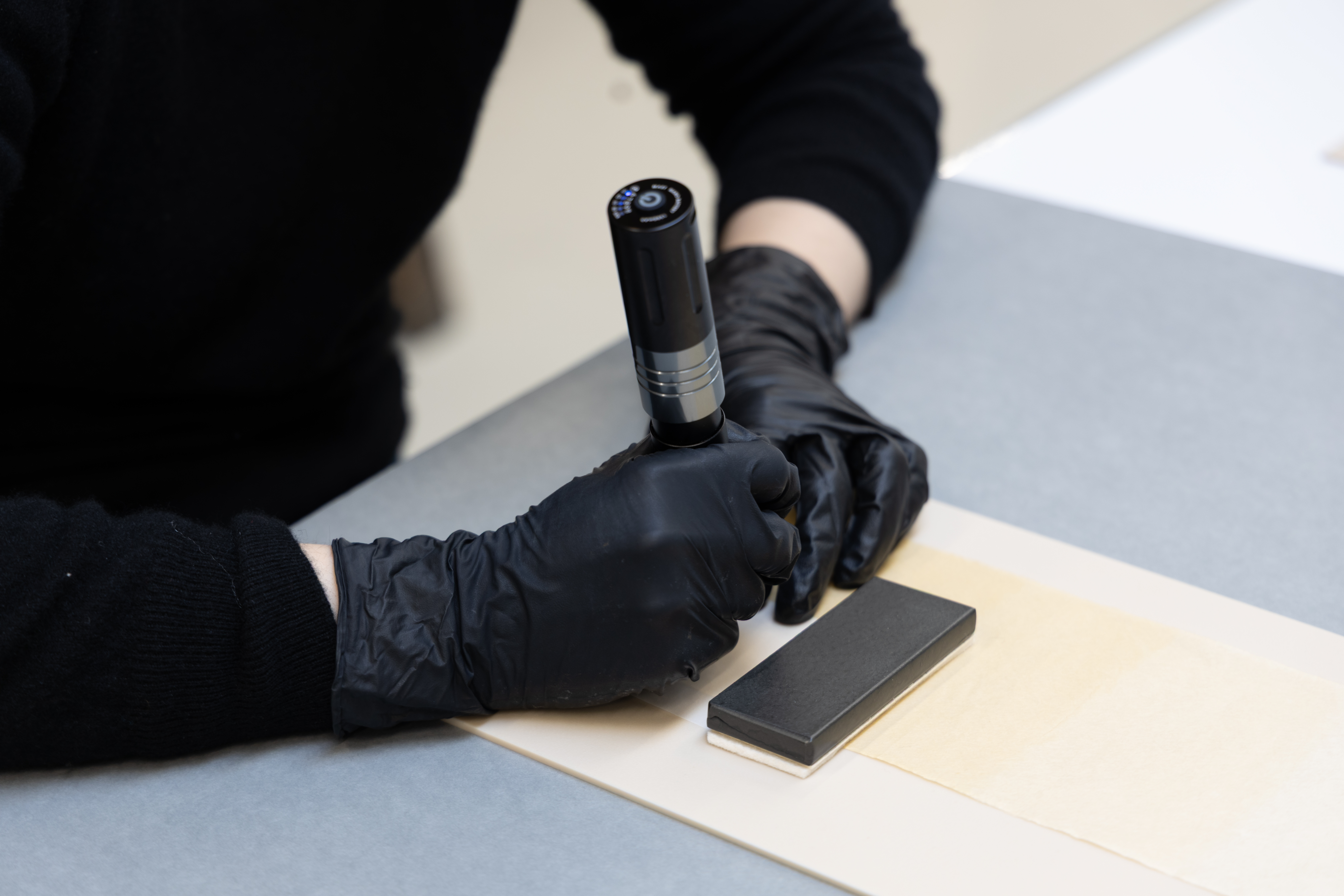 Conservators often repurpose tools from other fields, adapting them to meet specific technical needs. My initial inspiration came from the New York Public Library, where conservators Grace Owen-Weiss and Barbara Goldsmith developed a paper perforation pen by repurposing a nose hair trimmer, adding a needle to convert it into a mechanical piercer. My goal was to find a more reliable alternative that could be integrated into conservation practice without complex modifications. I wanted a tool that was compact, portable, and designed for repetitive, controlled motion. Digital cutting machines with an integrated scanner offer precision, but they are not suited for mobile or in-situ work. Then I thought of a tattoo pen. Although designed for skin, this tool features a mechanism that is surprisingly well-suited to conservation needs.