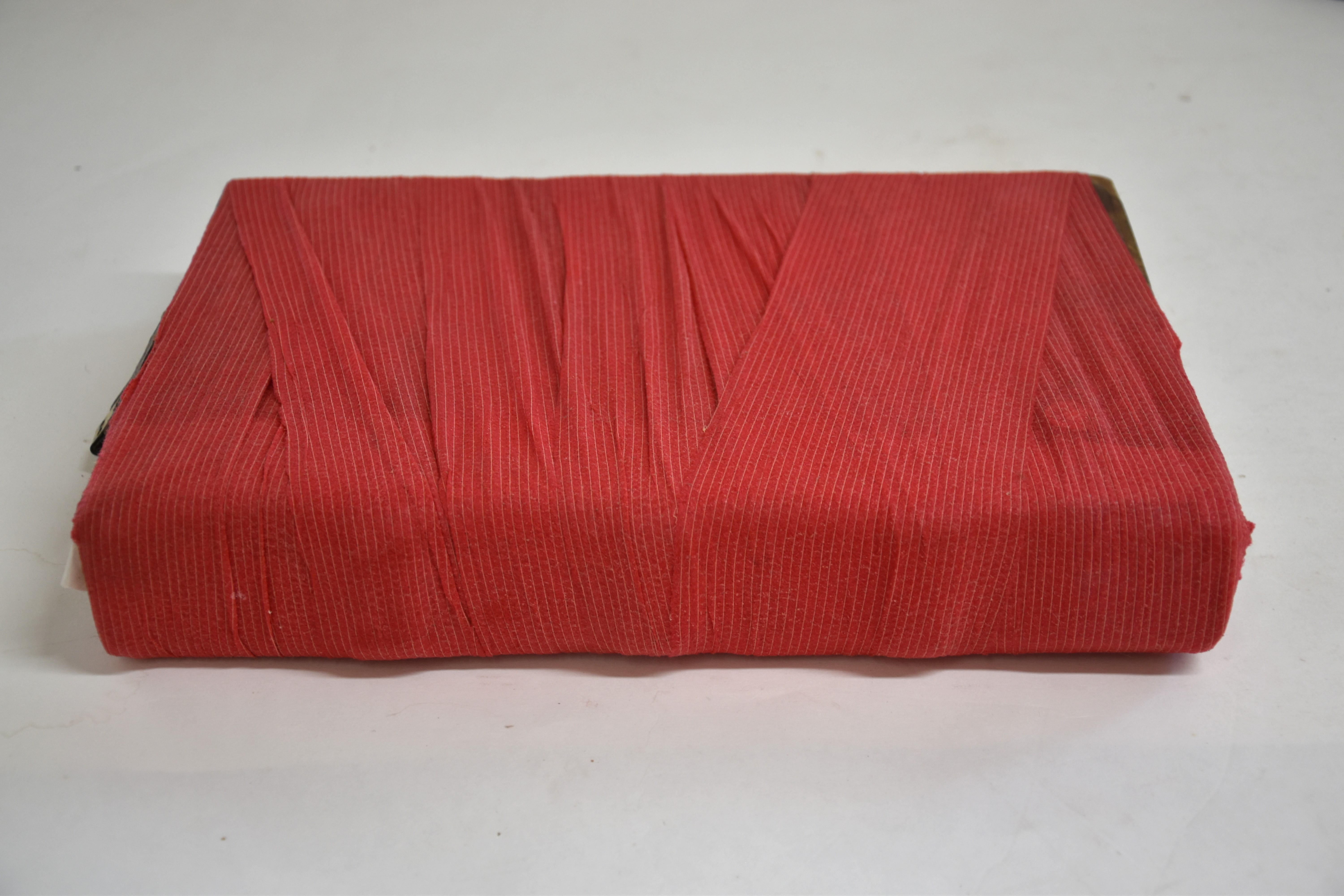 Keep in mind that if the volume requires bandaging (Fig. 6), for example to secure the adhesion of the spine, it is best to remove the bandages after a few hours instead of keeping them on overnight. This is to allow the solvent to evaporate properly. The evaporation of the solvent also slows down whenever the leather is covered (for example, with blotters). If the leather is kept covered overnight, it will still be permeated with the solvent and will look very dark when uncovered the next day. However, it will still return to its original colour after some additional evaporation time (about 24 hours). Over the years, I have used cyclomethicone on many types and colours of leather, and I have never yet seen a permanent colour change.